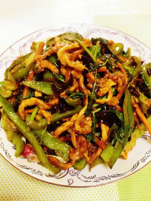 将笋丝、木耳丝放入翻炒几下,倒入鱼香汁和葱末,翻炒均匀即可出锅!