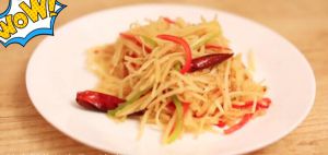 接着加入肉丝继续翻炒1分钟,加入少量的白糖和醋,生抽继续翻炒。