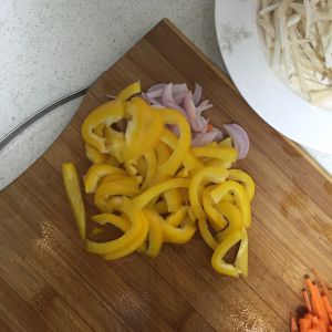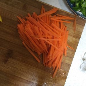茭白、胡萝卜、青椒及黑木耳切丝备用
