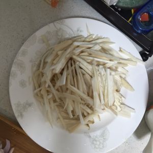 里脊肉洗净切丝,放入盐、白胡椒粉、料酒、马铃薯淀粉上浆,再倒入一点食用油拌匀,腌制10分钟