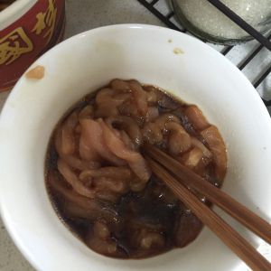 里脊肉切丝 放进小碗 加一勺油 加半勺盐 生抽半勺 老抽半勺 料酒半勺 糖少许 生粉一勺 拌匀 放十分钟