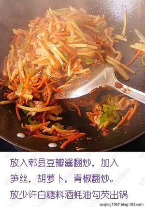 放入郫县豆瓣酱翻炒,加入笋丝,胡萝卜,青椒翻炒,放少许白糖,料酒,耗油,勾芡出锅。