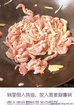 锅里倒入热油,放入葱姜蒜爆锅,倒入肉丝翻炒至发白即可。