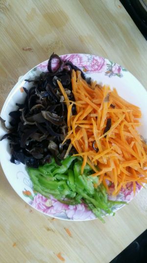 然后把准备好的胡萝卜,尖椒和泡发的木耳都切丝,将切好的木耳与胡萝卜过热水焯一下