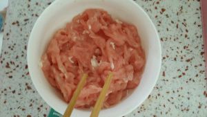 首先将里脊肉切丝,放少许盐,淀粉和鸡蛋清搅拌均匀备用