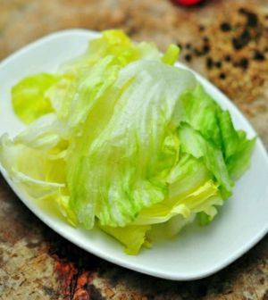 生菜做底菜(也可用豆芽,凤尾菜,芹菜代替)。生菜撕块后冲洗干净沥干水分备用。