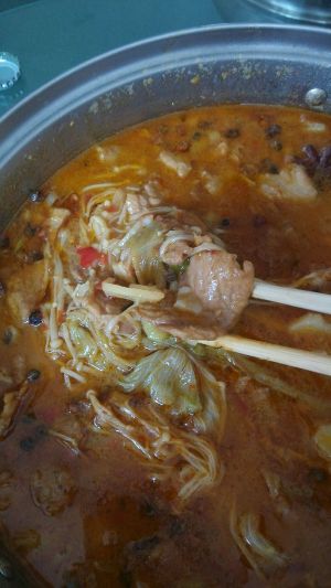 烧开锅放入事先用嫩肉粉腌好的肉片和金针菇 和泡好的木耳 用盐和鸡精 花椒面调味 煮熟后倒入碗中