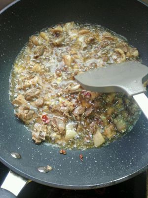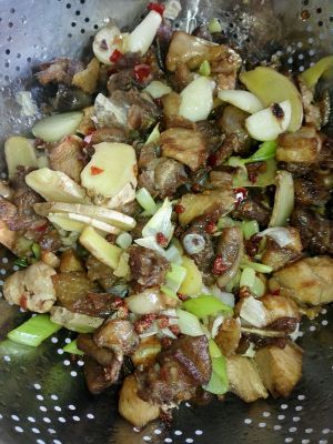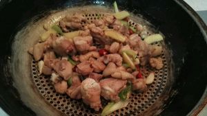 将尖椒捞出,油剩在锅里,然后倒入刚刚捞出鸡块姜葱蒜等,加一大碗水盖过鸡肉,然后大火煮开,中小火焖15分钟。