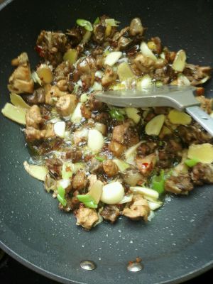 锅里放油,把姜片,蒜倒入锅中爆出香味。 盛一勺辣椒到锅里面翻炒。然后倒入备好的鸡块,继续翻炒。