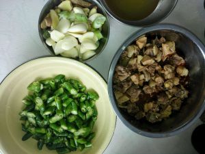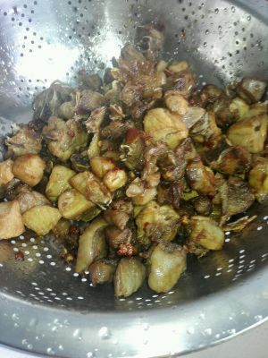 把鸡腿肉切块儿,洗去血水,用老抽,十三香,盐腌制约十分钟。