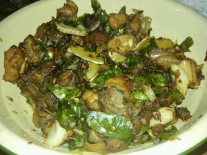 撒上葱花,芹菜丝,孜然,再加盐少许。翻炒之后出锅。