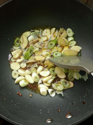 4、用少许油、待油温为完全热时炒香葱姜蒜,倒入辣椒和花椒爆香