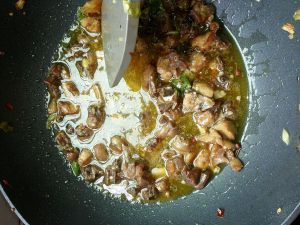 锅烧热,倒入油,稍多一点比较香且不易粘锅。然后马上放入鸡块,翻炒至鸡肉发白。