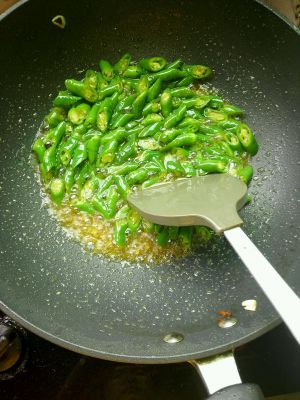 为确保鸡熟透,加一点开水(千万不要冷水哦!),盖锅盖焖烧。约三五分钟后听见锅底发出滋滋声,说明水基本干了,马上开锅,放入青椒和盐,翻炒几下关火出锅。
