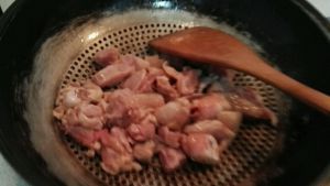 锅内倒入比平时炒菜多的油,三成油温时放入鸡肉,小火炒至微焦。