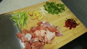 准备食材,尖椒切段,鸡切小块下水灼好,蒜对半切,姜切片,葱切段。