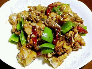 锅留底油,不要太少,下入绿花椒,和油温慢慢升高把花椒味道完全释放,再下入葱姜蒜片煸香,待葱姜蒜编干后下入干辣椒段,继续煸炒,干辣椒已经酥脆后下入鸡肉,煸炒,一定要多煸炒一会才入味。小火炒就行,主要为入味。然后下入花生米继续煸炒,我懒得现做花生直接放的黄飞鸿花生米,炒干香后下入一点生抽,少许盐,鸡精,粗辣椒面,青蒜、芝麻出锅。不要怕把菜炒干,这就是入味的过程,炒越久越入味。