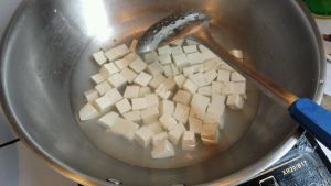 豆腐切成2厘米见方的块,锅中倒入清水,大火加热沸腾后加少许盐,随后把豆腐放入锅中焯2分钟,捞出沥干水备用