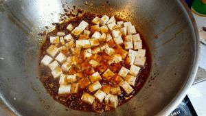 放入豆腐,不要翻炒,先抖锅,待豆腐上色后再轻轻翻炒,以免豆腐碎掉。