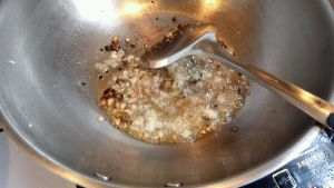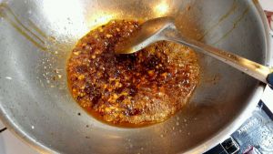 放入剁碎的豆瓣酱跟豆豉,下姜末,辣椒粉,炒出红油后加高汤