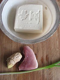 豆腐切块用淡盐水浸泡10分钟,沥干水分。