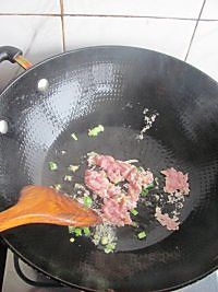 锅内加少许菜油,大火加热,油热后依次加入豆瓣酱、盐、干红辣椒、青蒜、姜末、花椒粉、牛肉末、也可将牛肉末用上述调料腌好后一并加入。 炒香。