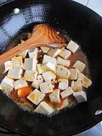 待豆腐熟后,改大火,加入由水淀粉、糖、酒、味精、酱油调好的芡汁。待芡汁均匀附着后,关火,起锅。