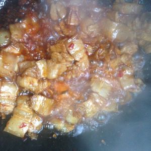 五花肉烧至变色+葱姜蒜白酒炒香+豆瓣酱翻炒+豆豉炒匀,加入辣椒