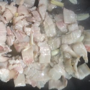 锅内加入少许油,将五花肉入锅煸炒,直到肉变成金黄色盛出来(期间不用放任何调料),将多余的油沥出留在锅内。