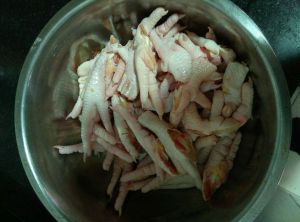 凤爪去指甲后放锅里煮熟,熟后捞出来用冷水冲凉凤爪