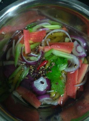 将芹菜、洋葱、胡萝卜切细后放到泡椒水里,加入适量的盐,然后洒上花椒