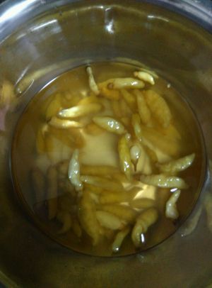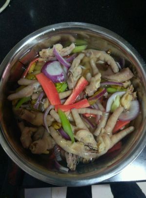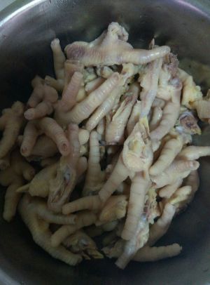 将买来的凤爪出去指甲 然后冷水没锅鸡爪 加一点生姜花椒料酒开始煮 水开后在煮十分钟即可 不要煮的时间过长 否则会化掉 煮好好在切成小块 用凉水反复冲去表面油脂 备用