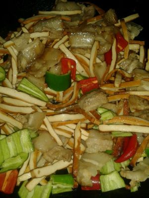 最后放入肉片、豆干、青红辣椒炒均匀即可。