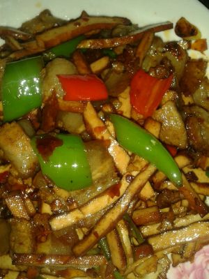 放入豆干、青红辣椒翻炒片刻,出锅控油。