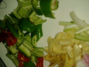 青红椒洗净切块;姜蒜洗净切片;葱白洗净切段。