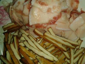 香菇洗净一切四块,黑木耳泡发摘洗干净,彩椒洗净去籽切条,蒜苔洗净切段。
