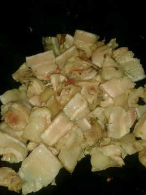 热锅倒入少量油,将回锅肉加入锅中翻炒变色。