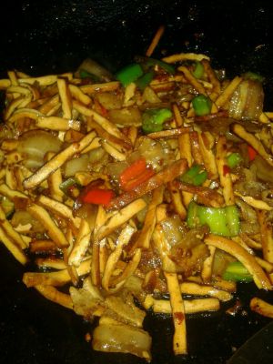 最后,放入切好的青椒丝,翻炒片刻,出锅即可