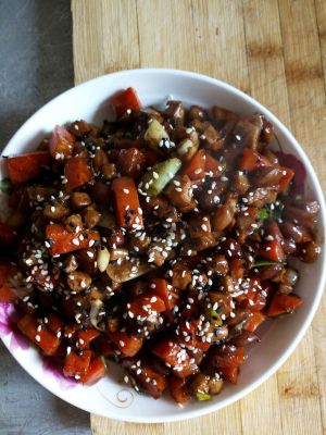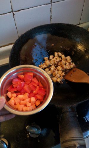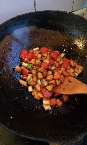 放入鸡丁、胡萝卜丁、黄瓜丁、柿子椒丁翻炒几下,然后倒入调好的酱汁翻炒均匀。