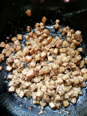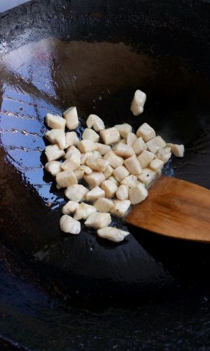 锅中预热,将腌制好的鸡肉丁倒入锅中炒至变色,盛出备用。