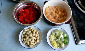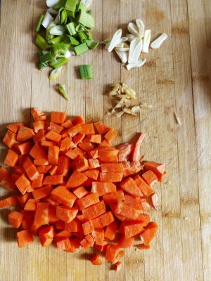 葱姜蒜切好,胡萝卜切成丁,家里没有黄瓜了,外面太冷,就不去买了。