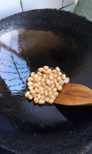 花生米用凉油炸(这样炸出来脆),我家里人也会先煮后炸(能够保持花生米放几天还是脆的),你们自己随便选哪种炸法都可以。炸好捞出备用。(给家里人吃着玩,所以炸的多放了盐。)