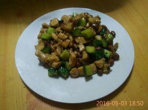 坐锅点火放油,油热可以加花椒和辣椒,然后放葱姜蒜煸炒下,加入鸡肉翻炒,接着加入适量的酱油,醋(如果粘锅可以淋点水),快熟时加入黄瓜丁翻炒几下,(看情况可以再加点盐),关火后放入炸好的花生米,搅匀即可入盘