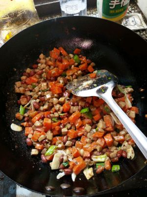 倒入葱姜蒜,花生米和胡萝卜丁。翻炒差不多就可以倒入调好的汁。就可以出锅了。