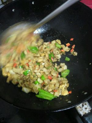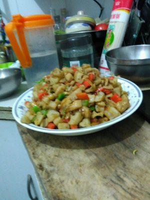 锅中剩下的油用来炒青椒丁和胡萝卜丁,先放胡萝卜丁,煸炒几下,再放入青椒丁,炒几下后,放入鸡肉丁,炒匀,然后再放入料酒、生抽、少量老抽、一汤匙白糖、一小勺盐,炒匀后放鸡精出锅即可