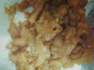 碗汁:醋3勺,生抽2勺,老抽大半勺,糖两勺,盐半勺,淀粉一勺。鸡丁翻炒几下倒入碗汁翻炒几下,下花生翻炒几下