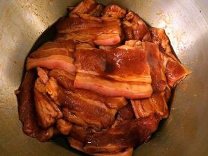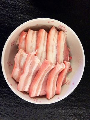 将五花肉切成薄片,加入酱油和盐,些许蒜和姜末腌制半小时。