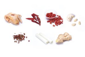 锅中倒入油烧热,然后将鸡腿和花生倒入油锅里炸至鸡腿颜色变至金黄,盛出沥油备用。