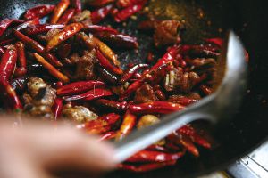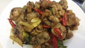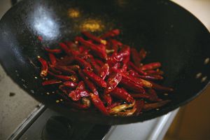炒至汁干,热辣辣的鲜椒辣子鸡就可以起锅了。
