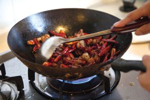 另起一炒锅倒入油,待油热后加葱、姜、蒜、干辣椒及花椒煸炒出香味。